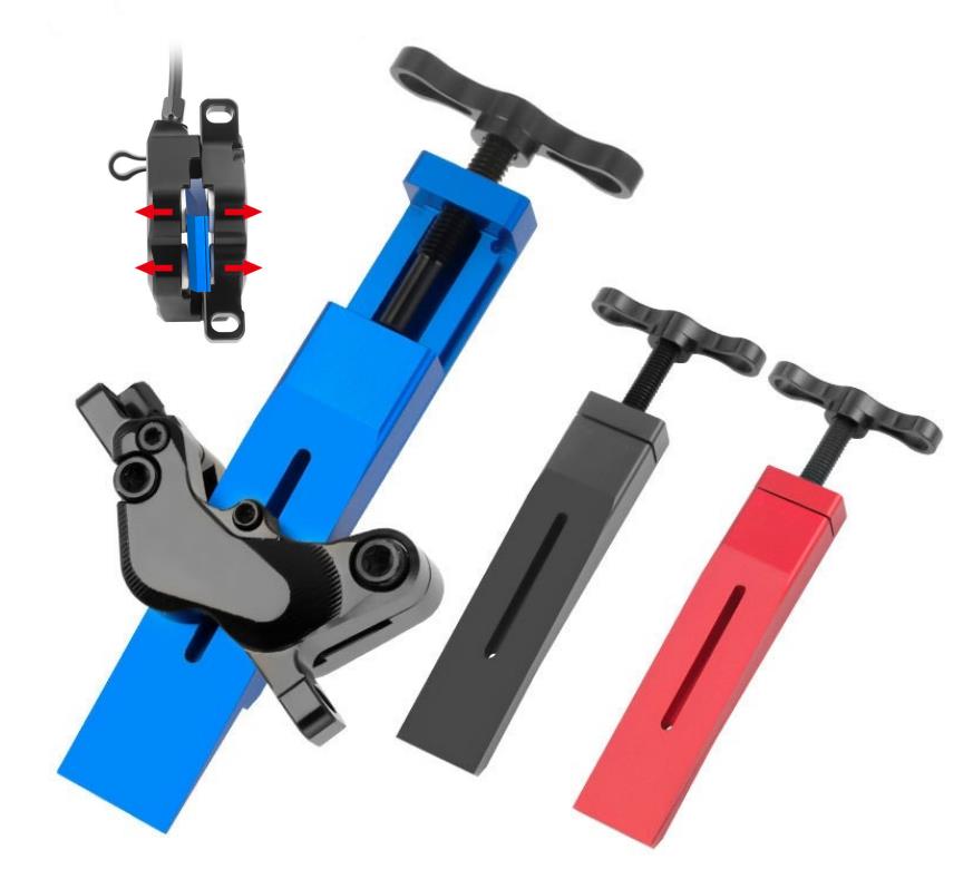 Caliper Piston Reset ToolMaterial: Aluminum alloyColour: Black, Red, BlueApplicable: Piston reseting for 2/ 4-piston caliper (SHIMANO, SRAM, MAGURA, HOPE disc brake ect,.)Size: 150*57*18.5mmWeight: 115g