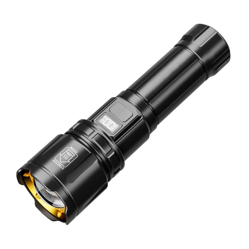 FlashlightZoomableLED: White laser wick LEDBrightness: 800 lumensMaterial: Aluminum alloyColor: BlackBattery: 3000mAh li-ion batteryModes: 4 lighting modesBattery life: 3-16hCharging port: TYPE-CSize: 177*50*37mmWeight: 277g