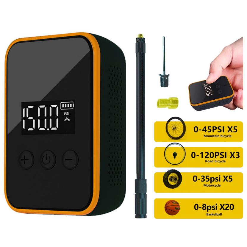 Mini E-pumpMaterial: ABS+PCColor: Black+OrangeAir pressure: 150psi/ 10barBattery: 2000mAh lithium batteryCharging port: TYPE-CApplication: Schrader/ Presta ValveSize: 83*54*37mmWeight: 175g