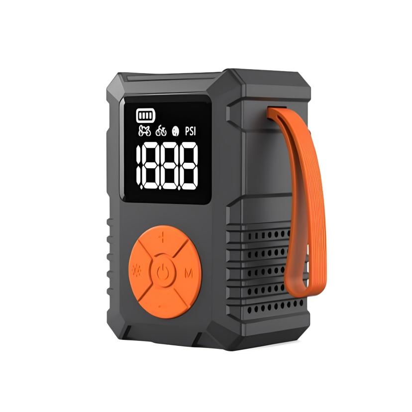 Mini E-pumpMaterial: ABSColor: Black+OrangeAir pressure: 120psi/ 8.3barBattery: 2*800mAh lithium batteryCharging port: TYPE-CApplication: Schrader/ Presta ValveSize: 87*45*56mmWeight: 153g