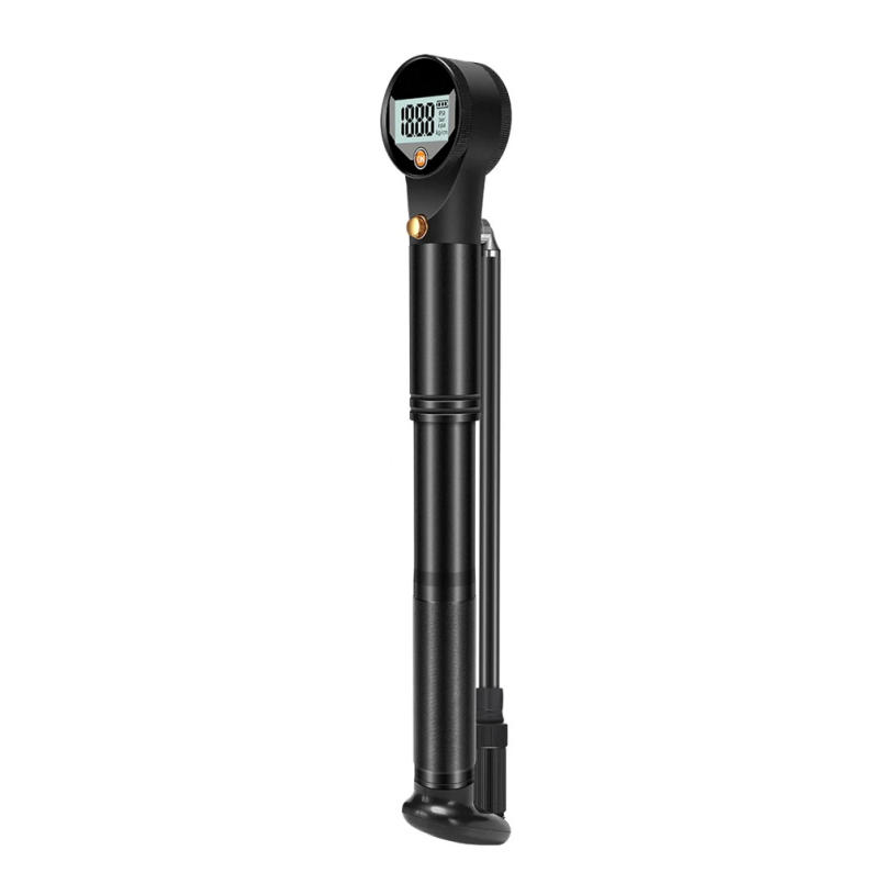 Bicycle Fork PumpWith digital displayMaterial: Aluminum alloyColor: BlackAir pressure: 320PSI/ 22BARApplication: Schrader/ Presta valveSize: 280*48mmWeight: 174g