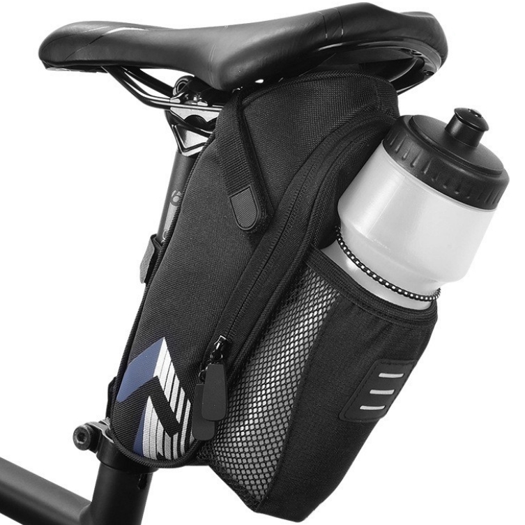 Bicycle saddle bagMaterial: PolyesterColor: BlackSize: 9*9*25.5cmCapacity: 1.8LFeatures: With reflective strip, waterproof, bottle storage, rear light attachableWeight: 134g